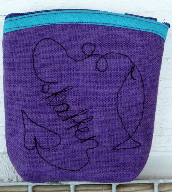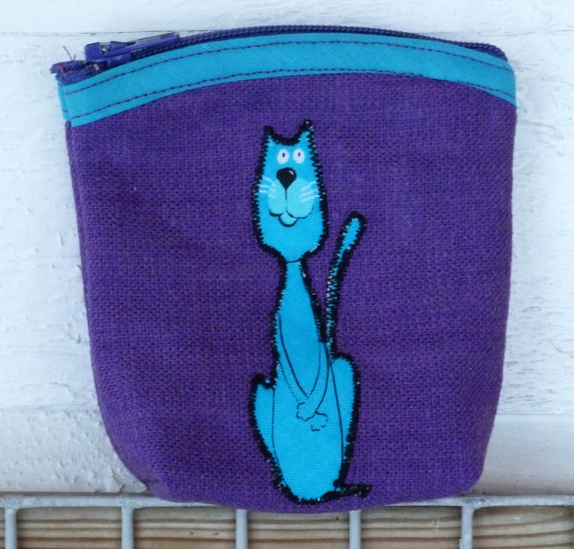 Lin m/ applikert kattemotiv og frihandsbrodering/tekst ("s katt") på baksida.Vattert og fora.Mål: 10cm x 11cm. Botn 3,5cm.