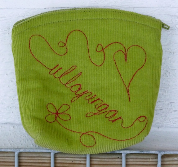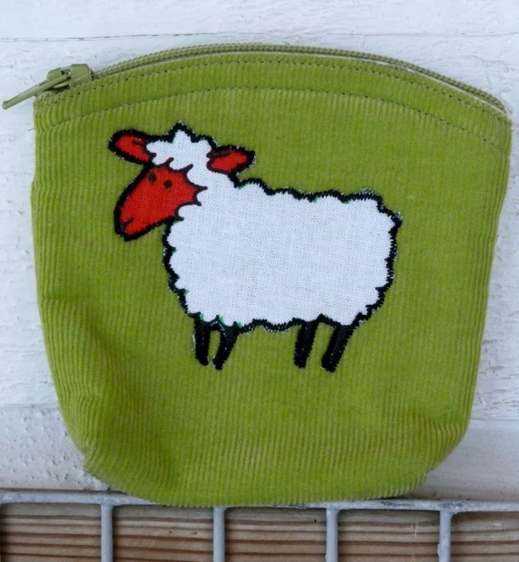 Cordfløyel m/ applikert sauemotiv og frihandsbrodering/tekst ("ullapengar") på baksida.Vattert og fora.Mål: 10cm x 11cm. Botn 3,5cm.