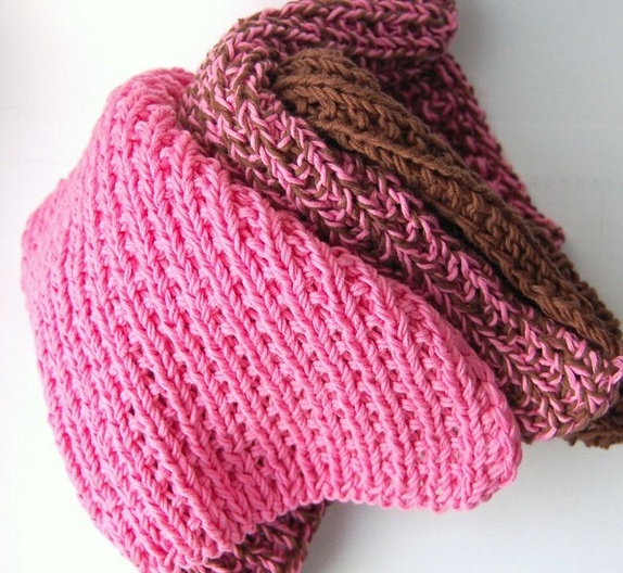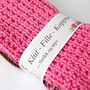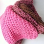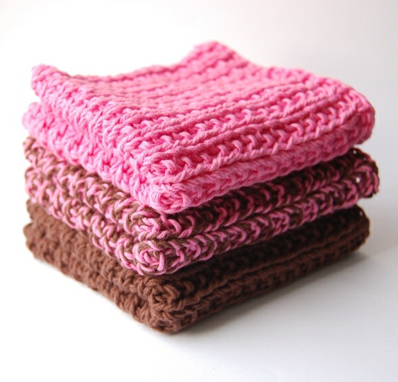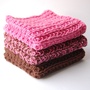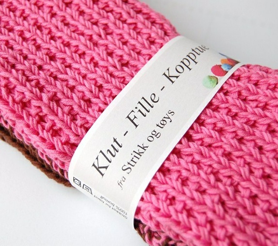 Dette settet er i rosa og brunt, samt en melert. Klutene har jeg strikket for hånd.