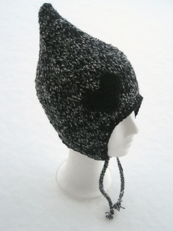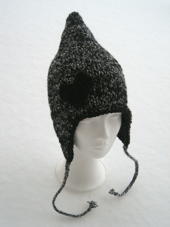 God og varm lue med alvespiss strikket i sort, naturhvit og grå ull. Luen har knytesnorer i sort, naturhvit og grå ull, og heklekant og et strikket hjerte i sort ull.