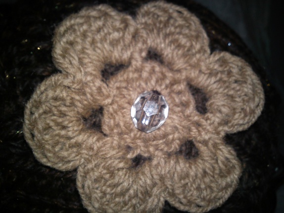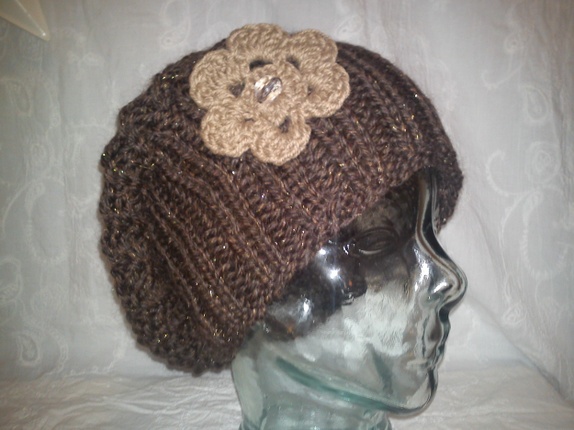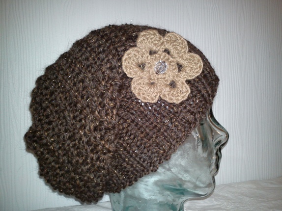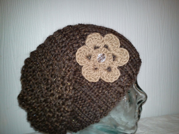 Denne luen er strikket i ett tykt, mykt og varmt garn, i brun med gulltråd i, blomsten er heklet og sydd på med en stor blank perle som gjør luen fin både til hverdag og fest.