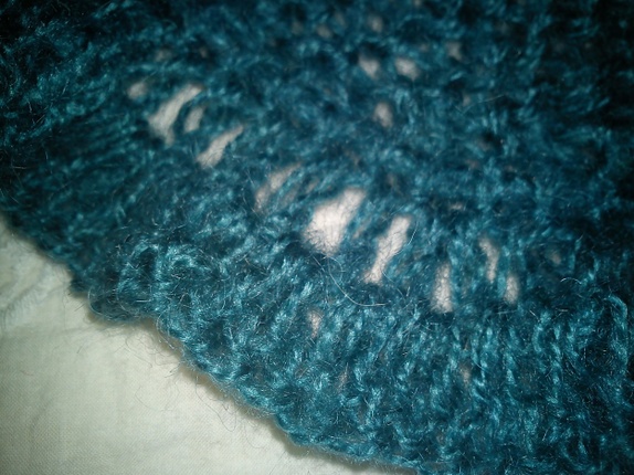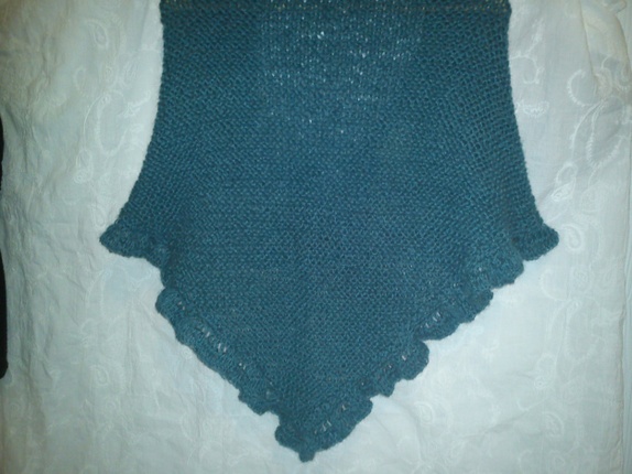 Dette sjalet er strikket i dobbel kitten mohair og pyntet med en søt heklet blondekant, sjalet holder deg varm på kalde vinter dager, eller pynter opp fjorårets festkjole ;)