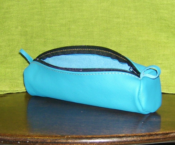 22cm langt i ekte skinn. Gul kontrastfarge på sømmen ved glidelåsen.