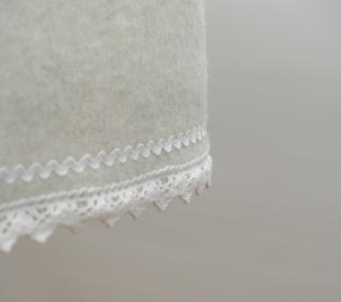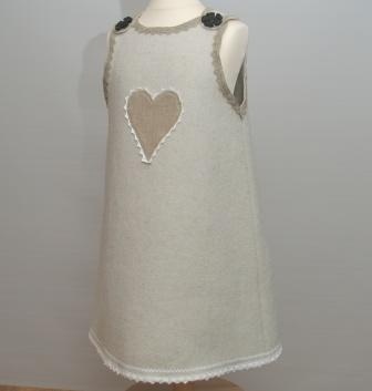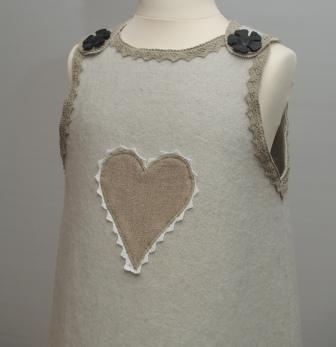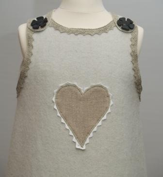 Kjolen er pyntet med en linfarget, vevd bomullsblonde rundt halsen og armhulene. Langs nedre kant er det en hvit, vevd blonde og en smal hvit kroklisse. På brystet er det applikert et hjerte, klippet fra en grovvevd bukse i 100% lin.