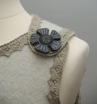 I selene er det store, sorte, blomsterformete knapper. De kraftige knappene passer godt til det tykke ullmaterialet i kjolen. Knappene er håndlaget i Nepal, fremstilt med enkle verktøy. Bedriften som lager knappene har en sosial profil, slik at vi vet at arbeiderne blir godt ivaretatt.