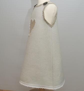 God og varm vinterkjole sydd av et ensfarget, naturhvitt ullteppe. Kjolen er perfekt til å holde små, kjoleglade frøkner varme på kalde vinterdager, utenpå en genser og en strømpebukse eller bukse.