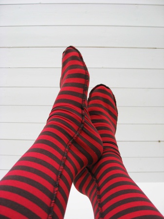Lange, deilige knestrømper som rekker til knærne. De er sydd i stripete bomullsjersey i brunt og rødt. Knestrømpene er fasongsydd med en dekorativ overlocksøm på utsiden. De finnes i 2 størrelser: 36-38 og 39-41.