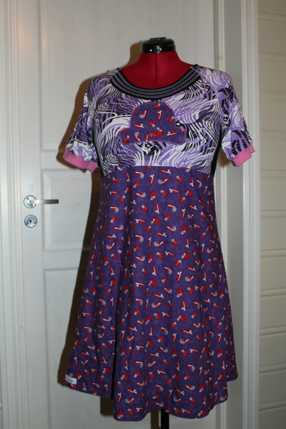 Denne kjolen er sydd saman av ein topp frå "Emil", lilla bomullsstoff med mange ulike små røde hattar, og rosa ribb.