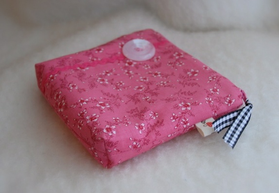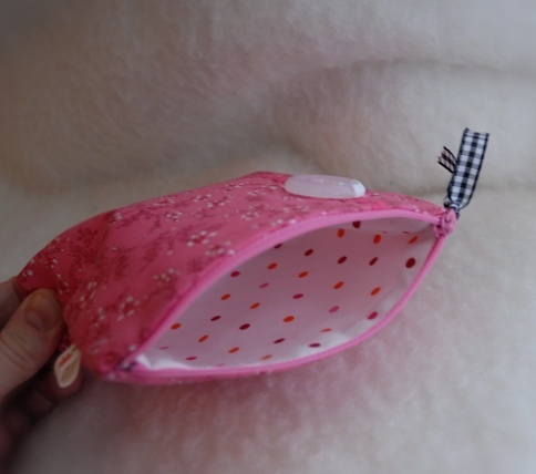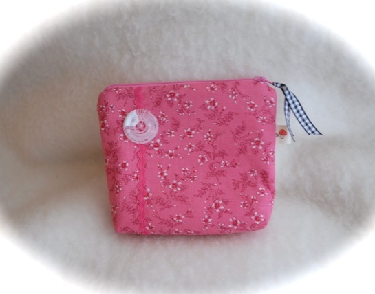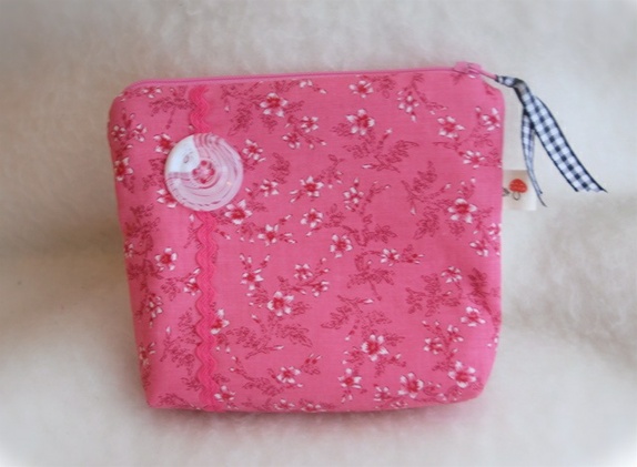 - En passe stor pung laget i et trivelig bomullstoff - små røde blomster på korallrosa bunn.