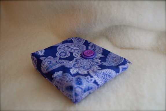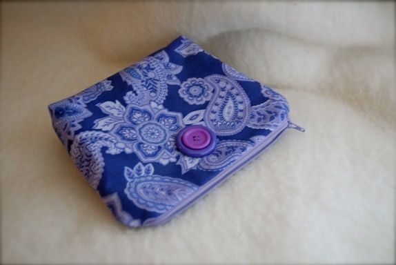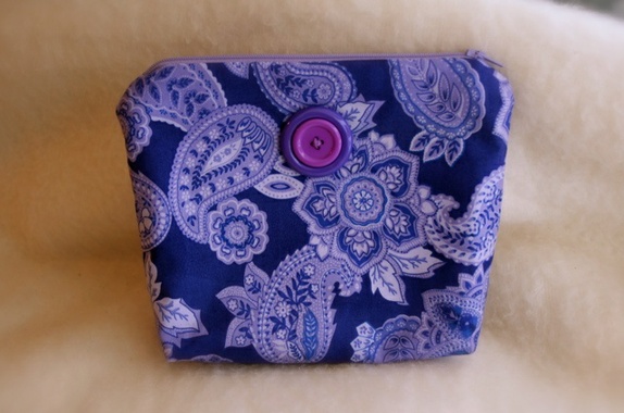 En middels stor sminkepung laget i bomull, paysley i blå og lavendel nyanser.Foret med stoff i lavendelfarget bomull.