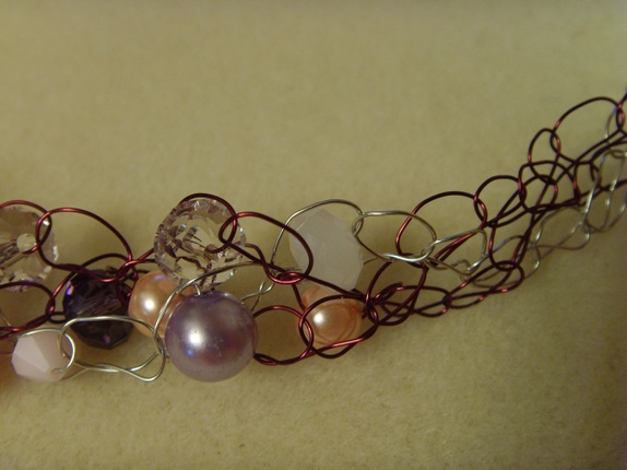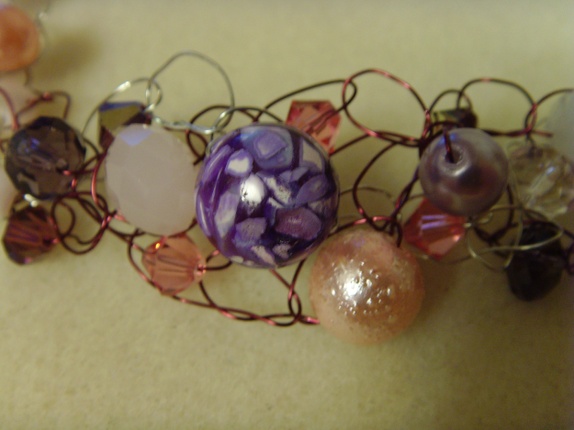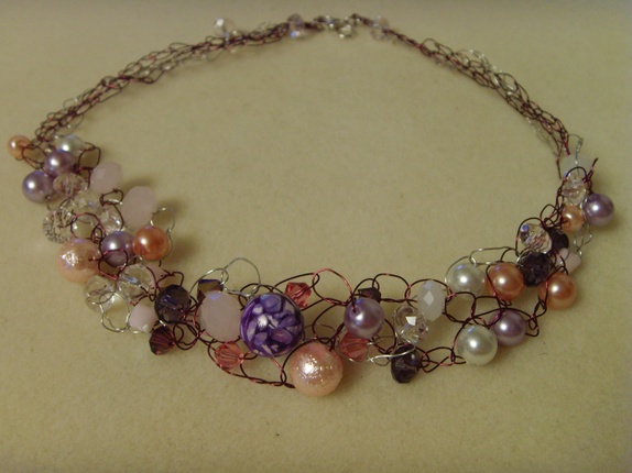 Kjedet er laget av lilla og sølvfargede kobbertråder. Jeg har tredd på forskjellige perler av glass, krystall og swarovski-krystaller. Kjedet ligger meget pent i halsgropen.