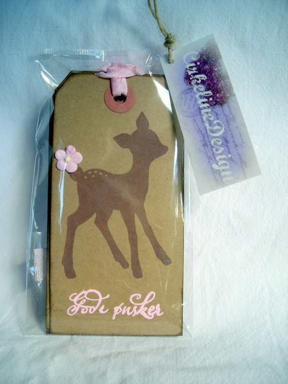 Lappene er håndstemplet med yndige Bambi i sjokoladebrunt. Hun har rosa blomst på halen. "Gode ønsker" er embosset (forhøyet) i rosa. Kantene er svertet for en "vintage look". På baksiden er det stemplet "Til" og Fra", og det er plass til å skrive en personlig hilsen. Rosa sløyfebånd hører med.