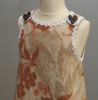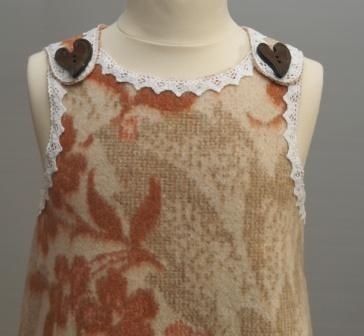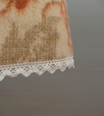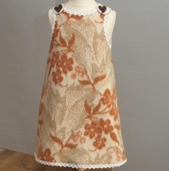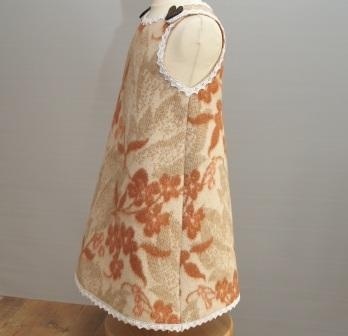 God og varm vinterkjole sydd av et ullteppe i varme, gyldne farger. Bunnfargen i ullteppet er lys beige, med mønster av store blomster i rustfarge og blader i lys brunt.