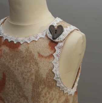 Kjolen er pyntet med en hvit, vevd bomullsblonde langs nedre kant, samt rundt halsen og armhulene. I selene er det store, brune, hjerteformete knapper. De kraftige knappene passer godt til det tykke ullmaterialet i kjolen. Knappene er håndlaget i Nepal, fremstilt for hånd eller med enkle verktøy. Bedriften som lager knappene har en sosial profil, slik at vi vet at arbeiderne blir godt ivaretatt.