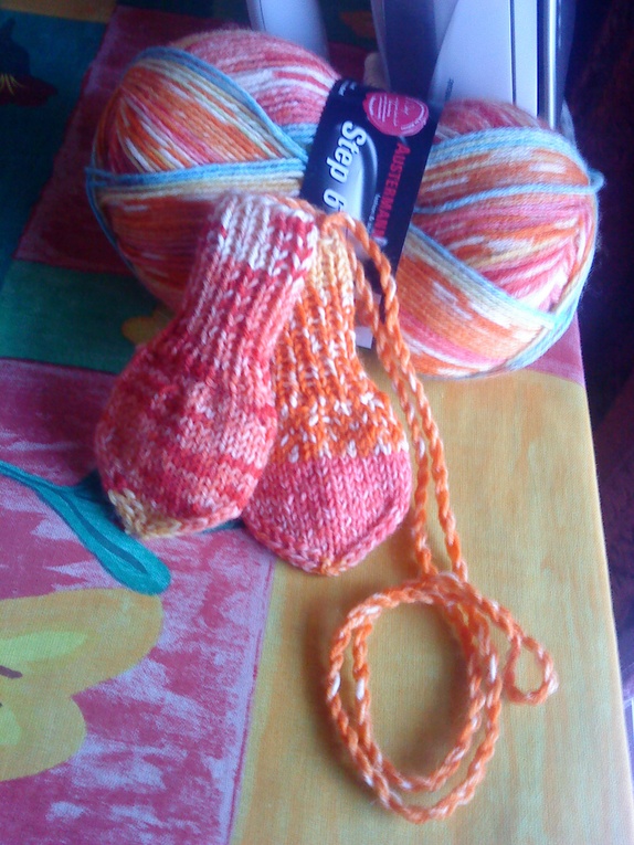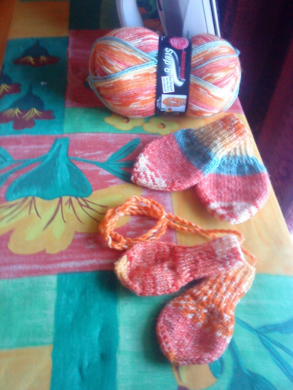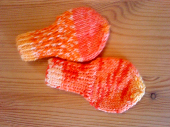 Liten babyvott uten tommel, med nakkesnor ;)13 cm total lengde. Bredde 6,5 cm.Laget av et flammefarget garn i blandingskvalitet.