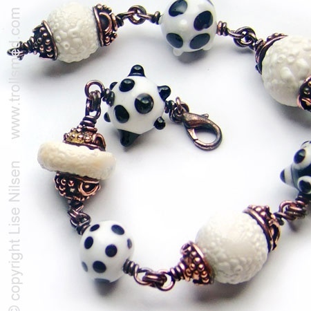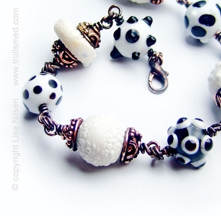 Lekkert sorthvitt armbånd - Porselen, lampwork og kobber