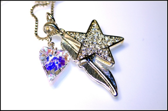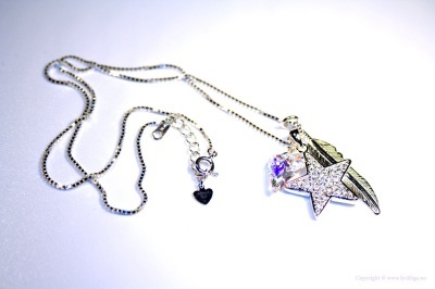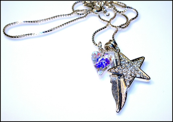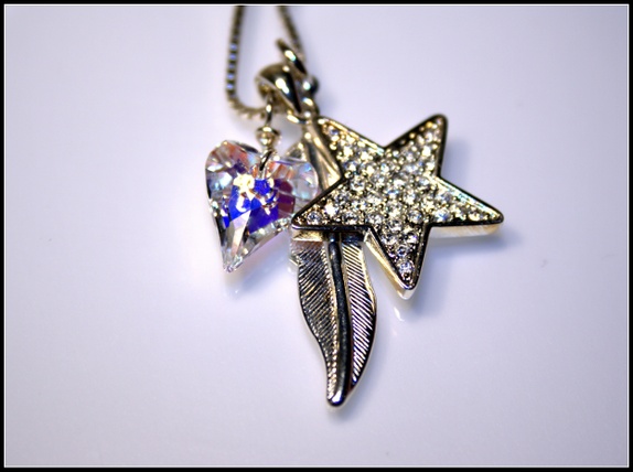 Herlig smykke med 3 charms, en forsølvet fjær, en forsølvet stjerne og et Swarovskihjerte i fargen Clear AB. Kjedet er i 925 Sterling Silver.