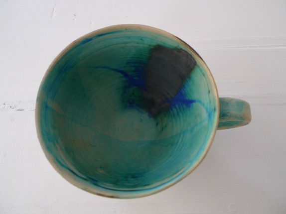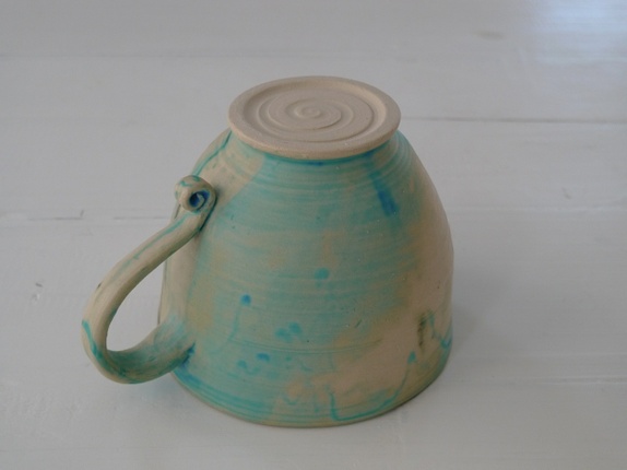 Stor og god kopp dreiet i steingodsleire dekket med matt turkis glassur. Kan vaskes i oppvaskmaskin.