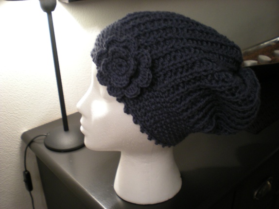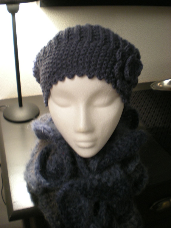 Strikket i deilig og mykt Nepalgarn fra Drops Design. 65% ull og 35% alpaca. Håndvask. Følg vaskeanvisning nøye. Vrangbord er strikket i perlestrikk med heklet picotkant og resten av luen i halvpatent. Blomst er laget som er brosje med nål bak. Baggy modell. One size.