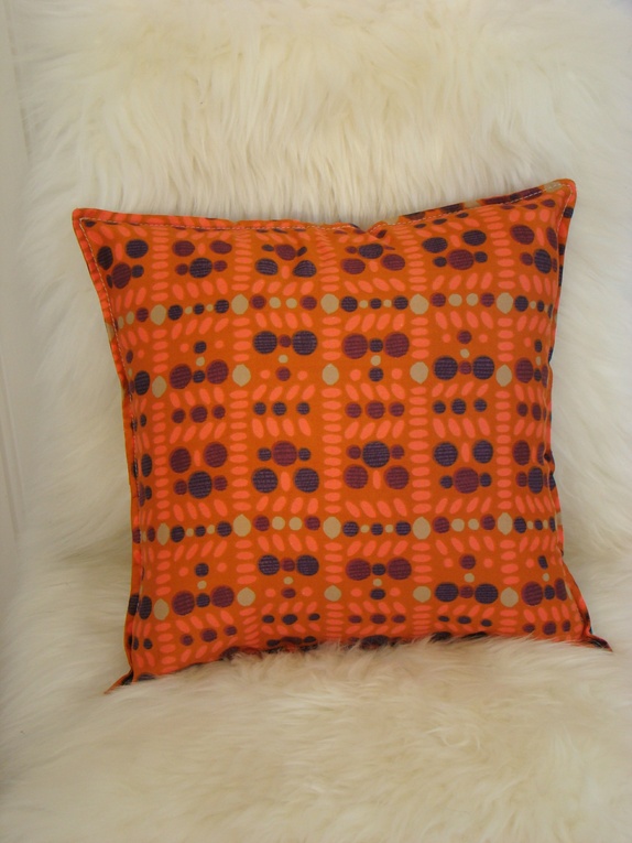 Pute sydd i vintagestoff. Stoffet er nok i en bomull-/viscoseblanding og har en fin blank kvalitet. Bakside i samme stoff og knappeåpning. Pyntesøm i tykk bomullstråd. Passer innerpute 40 x 40 cm, men denne følger ikke med.