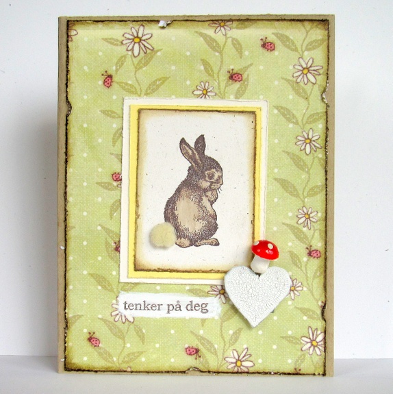 Det er pyntet med søtt designpapir i grønt, et håndstemplet motiv av en søt kanin med pompong-hale, et hvitmalt hjerte og en liten fluesopp. "Tenker på deg" er håndstemplet i sjokoladebrunt.