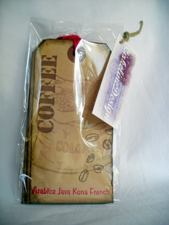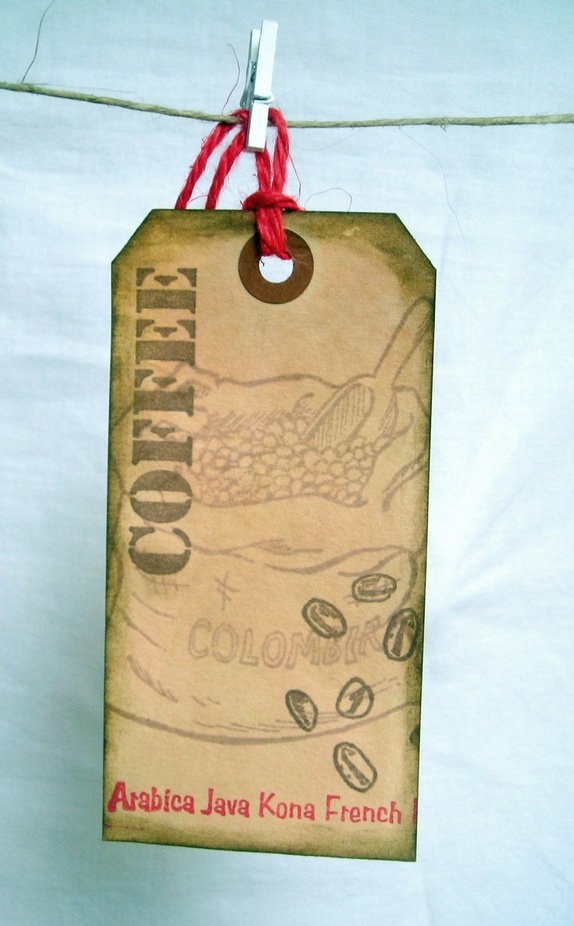 Gavelappene er først dynket i kaffe for å få et "antikt" utseende (og en svak kaffeduft!). De er deretter farget med distress ink og håndstempelet i bruntoner (og litt rødt) av meg. Kantene er svertet med mørk brunt blekk for å skape en vintage look.