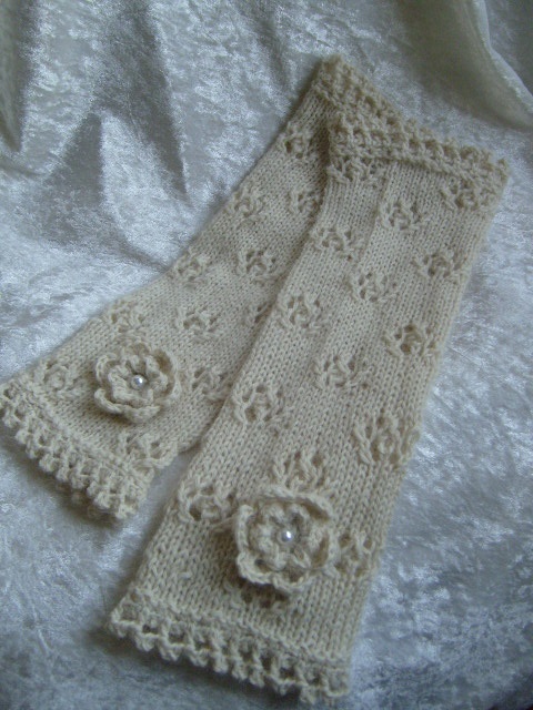 Gode og varme naturhvite pulsvanter som er strikket i blondemønster og med hekla kanter.Til pynt er det festet på en nydelig heklet blomst med hvit perle i midten. Pulsvantene har hull til tommelfinger.