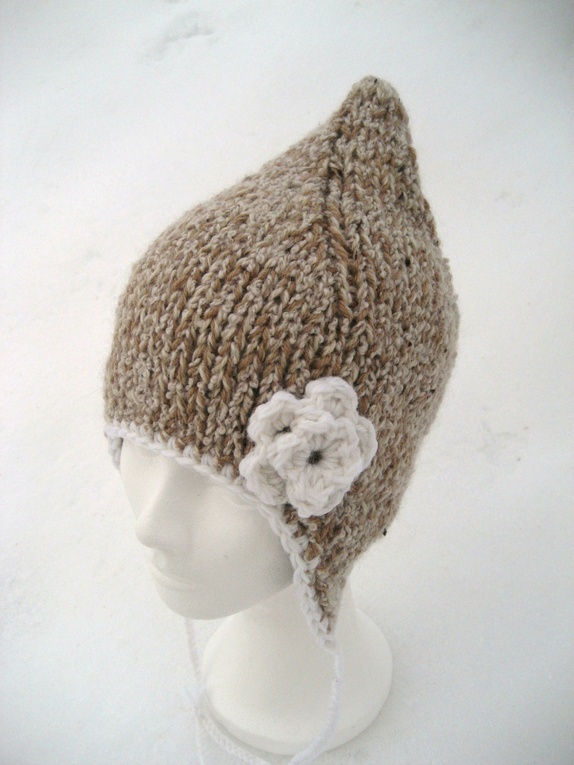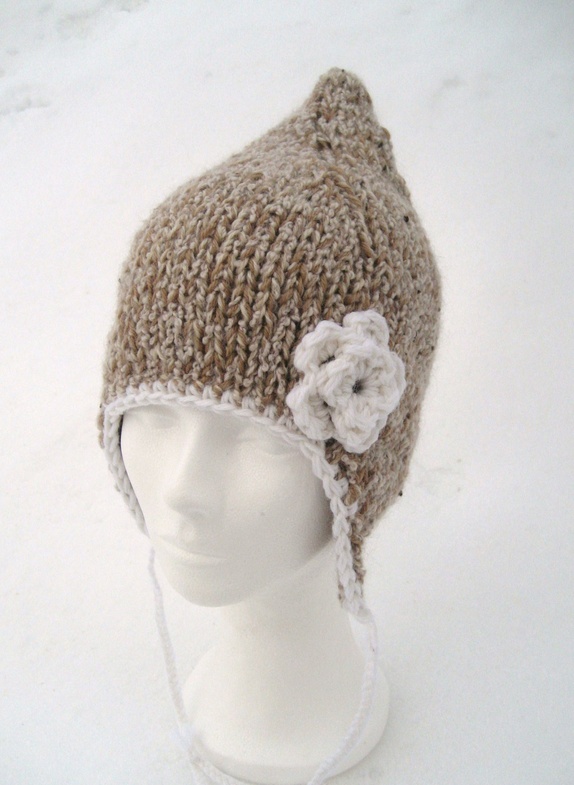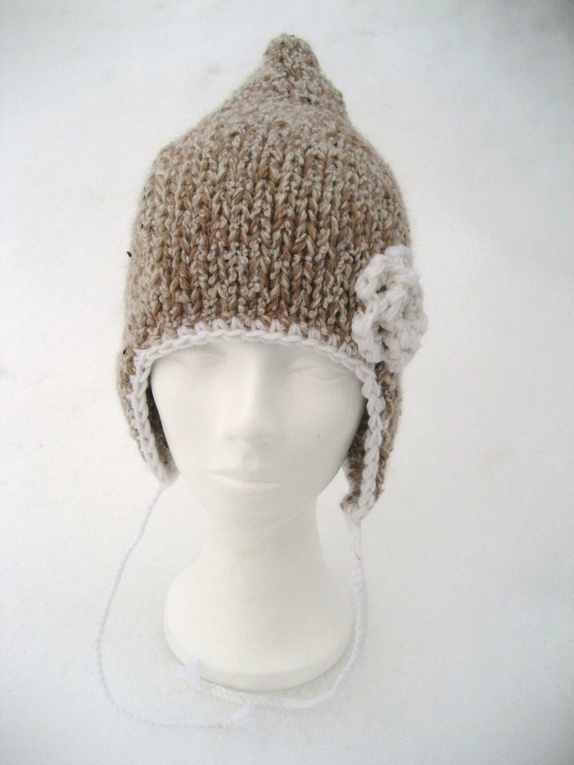 God og varm lue med alvespiss strikket i beige ull og effektull. Luen har heklekant, knytesnorer og en heklet blomst i naturhvit ull.