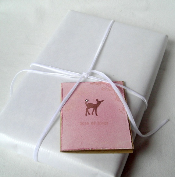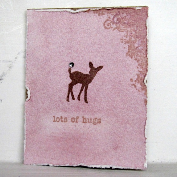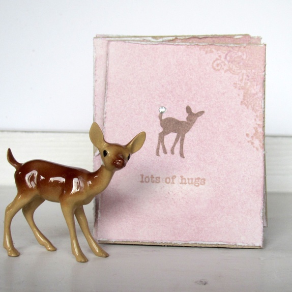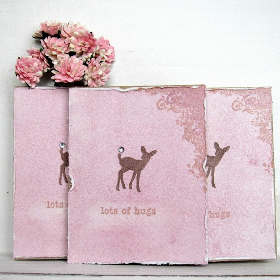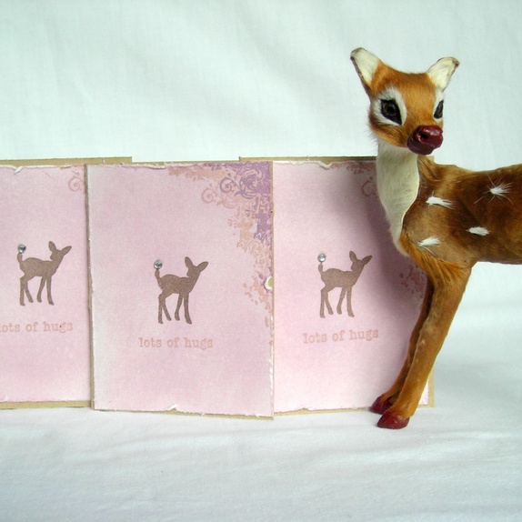 Kortene er pyntet med håndfarget lys lilla akvarellpapir, håndstemplet dådyr med "edelsten" på haletippen, teksten "lots of hugs" og håndstemplede detaljer i hjørnet.