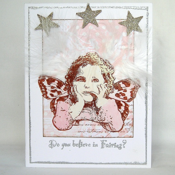 Fargene går i hvitt, rosa og sølv. Kortet er pyntet med hvite fjær, en fairy (alv), stjerner i sølv glassglitter og sølvembosset tekst: "Do you believe in fairies?"