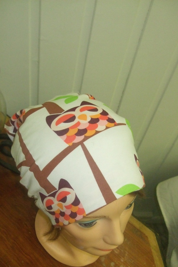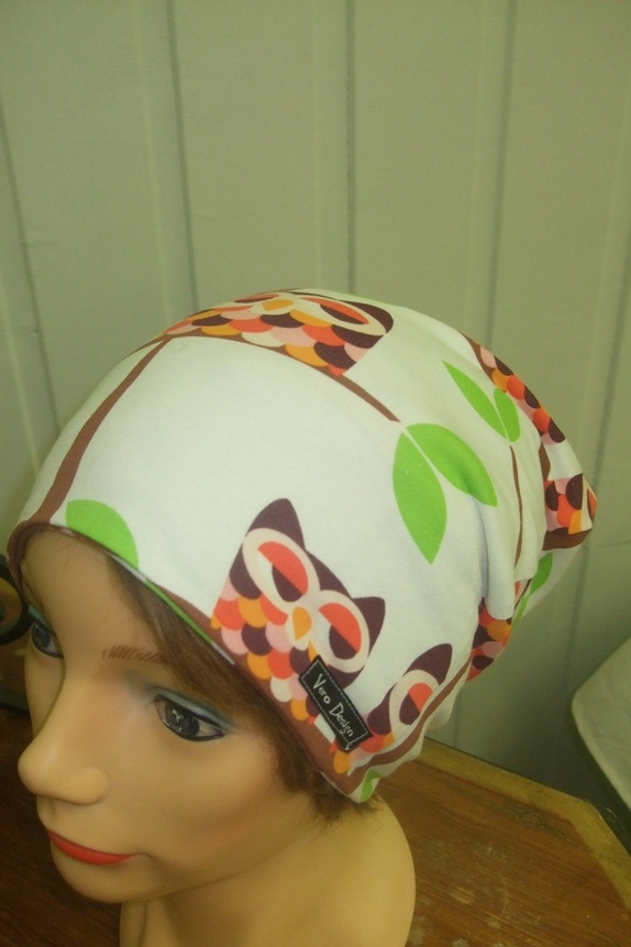 Stilig lue i voksen str med uglemotiv. Vrangsydd i to lag jersey, myk, behagelig og tøyelig. Baggymodell.