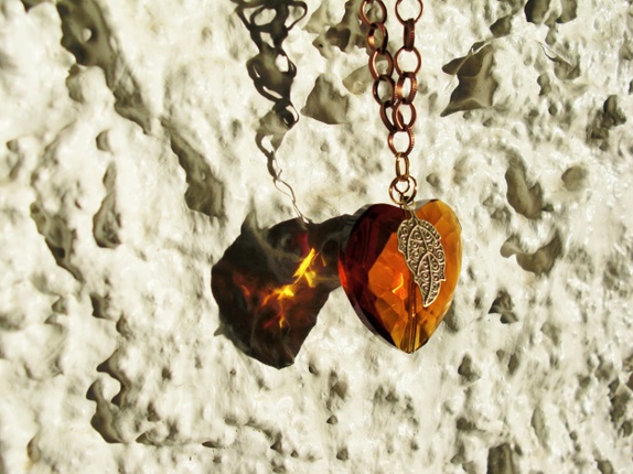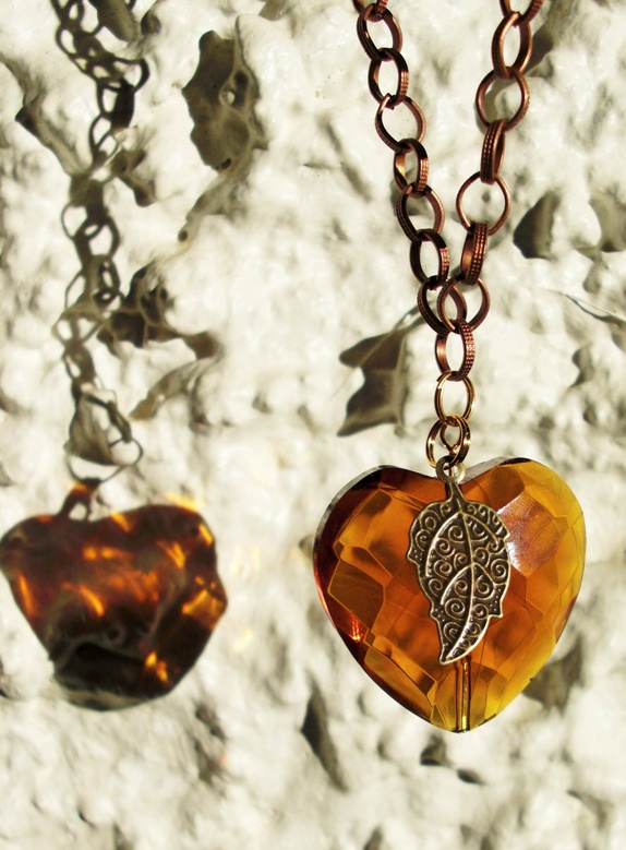 Pent ravfarget glasshjerte med nydelig blad hengende foran. Lenke i flott kobberfarge, som gjør smykket mer synlig.