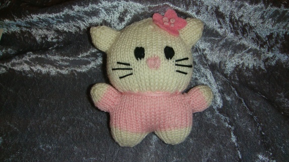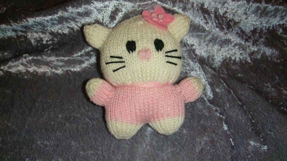 Hello Kitty er håndstrikket og er ca 13 cm lang.Til pynt har hun blomst av filt som er sydd godt fast med franske knuter.