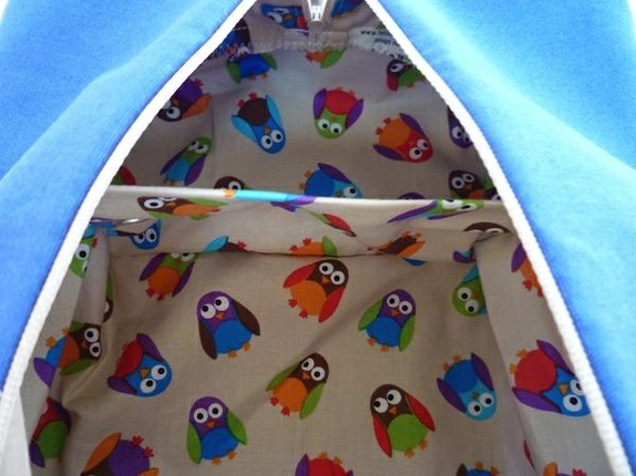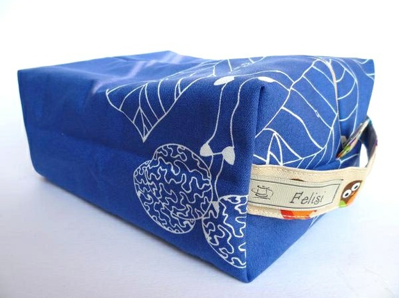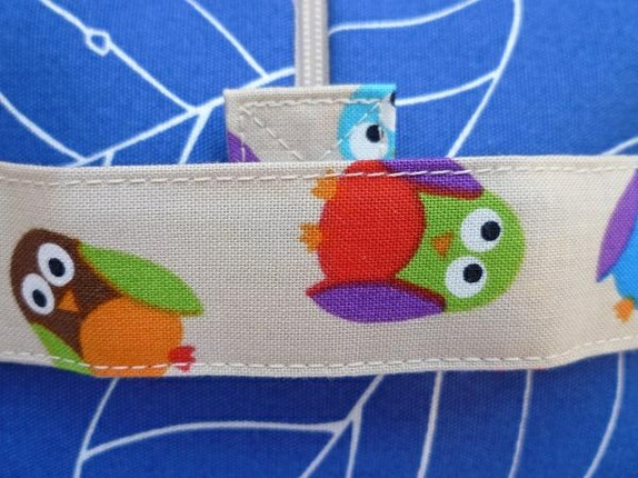 Mappen er sydd av kraftig bomullsstoff med mønstret bomull inni. Hanken er lik innerstoffet.