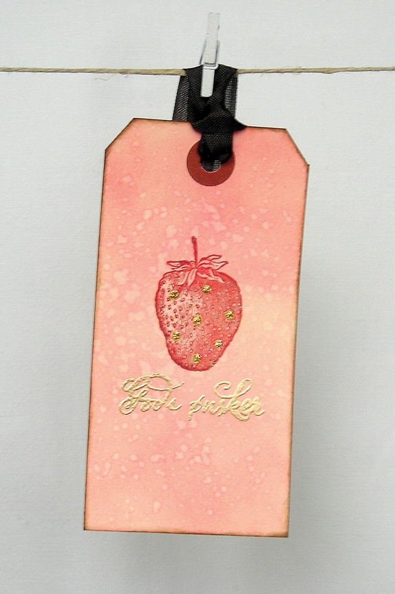 Jeg har farget bakgrunnen med rosatoner, stemplet jordbæret i mørk rødt og påført gullglitter som skal forestille groene på bæret. Svertede kanter bidrar til å gi kortene en "vintage look". "Gode ønsker" er embosset i gull. Sjokoladefargede sløyfebånd hører med.