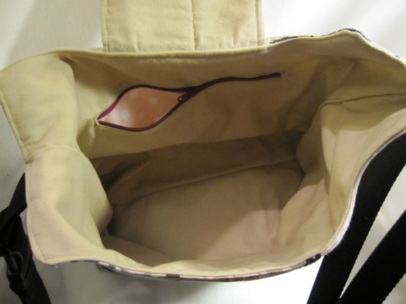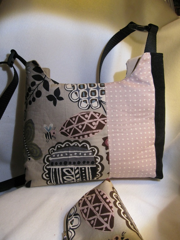 Bomullstoff, 1 lag med veskevatt av den sorten som ikke er veldig tykk. Det sorte stoffet er ruskinn. Magnetlås på veskeklaffen.