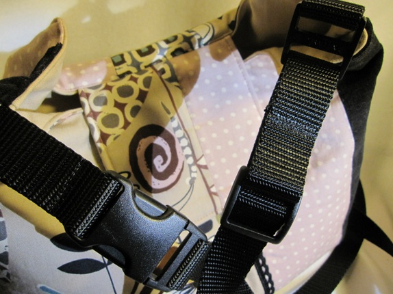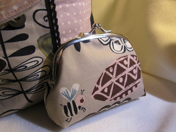 Pungen er ca 9 cm høy, bunn 4,5 cm. Bredde på ramme 12 cm. Stoffene er de samme som er brukt på utsiden av vesken.
