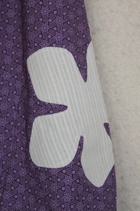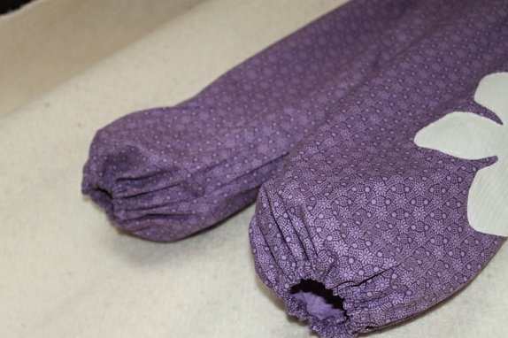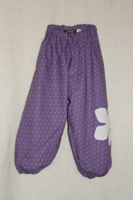 Vid og god bukse i nydelig småmønstret, lilla stoff.