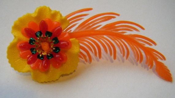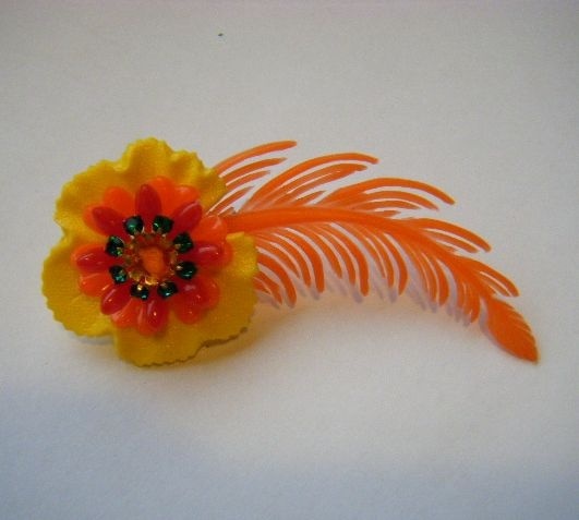 SALG før 375,- Nål/brosje i vinyage glass pg strass. 6.7 x 2.8cmFarger: Klar orange gul og rød. Strass: smaragd grønn. Frakt inkl. i pris