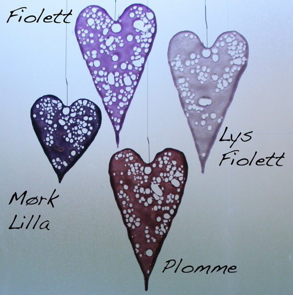 Farger jeg pleier å ha er: klar/is, plomme, mørk lilla, limegrønn, orange med spetter, vårgrønn, olivengrønn, lys rosa, mørk rosa, fiolett, lys fiolett, mørkeblå, blå, turkis, vannblå og neollilla (denne er skjør lyserosa/blå -skifter farve etter lysforhold og bakgrunn).Hvis du ønsker andre farger, antall, størrelser eller fasonger, se på min Epla-butikk eller ta kontakt med ID Glassdesign. Jeg har som regel flere på lager.