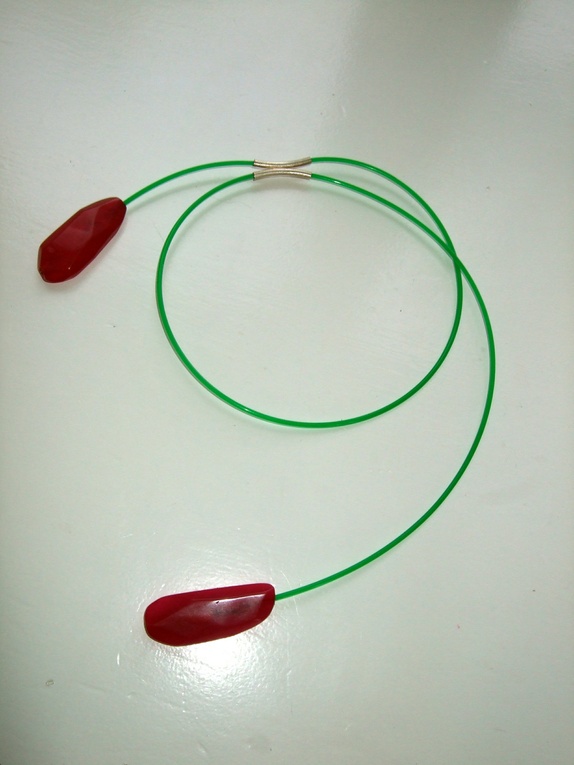 Halssmykke med rød jade med detaljer i sølv. Snor i grønt plast materiale.