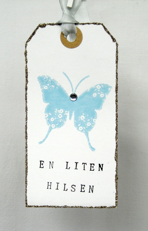 Gavelappene er dekorert med en sommerfugl som er håndstemplet med lys blå maling, sølv glassglitter i kantene og sølvhvite sløyfebånd. "En hilsen til deg" er håndstemplet i sort. På bakside er det stemplet "Til" og "Fra", og det er plass til en evt persolig hilsen.