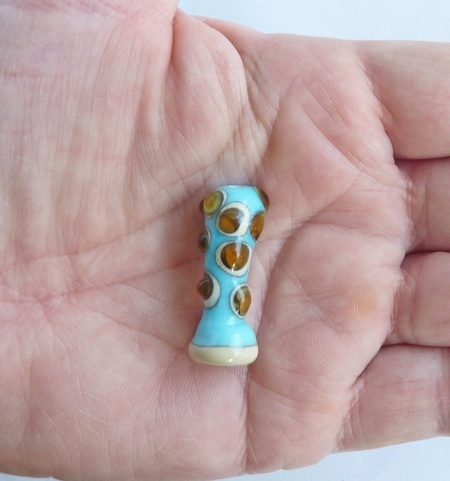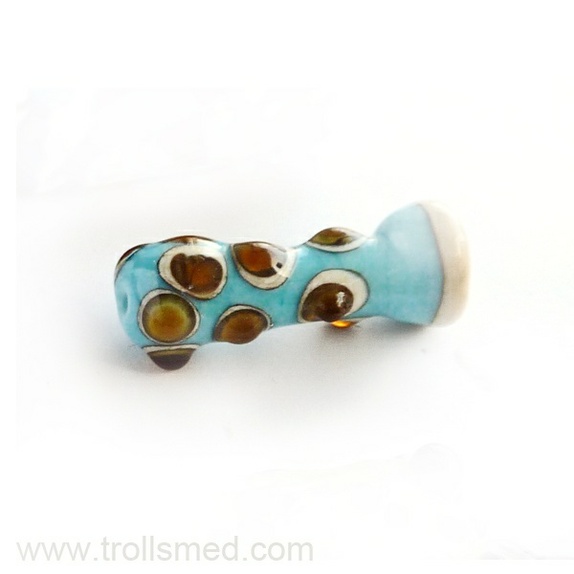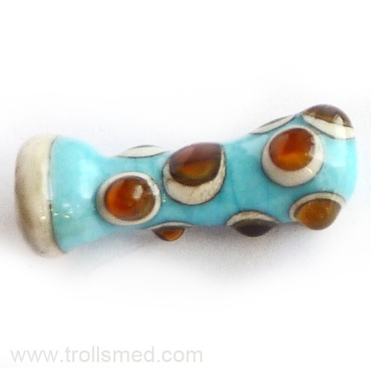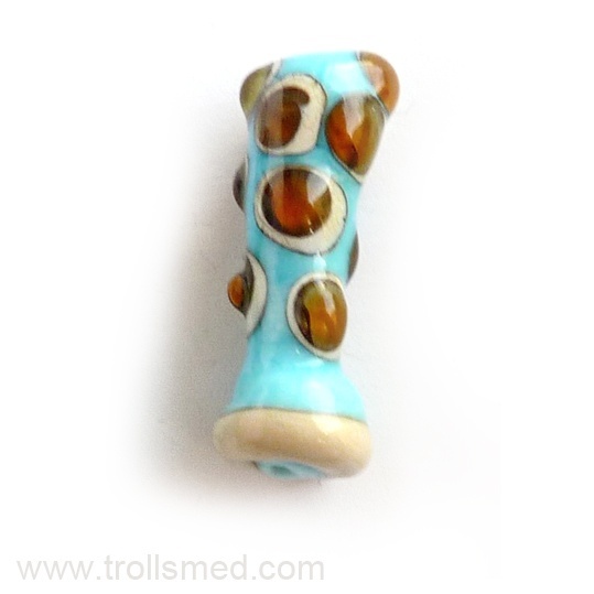 Håndlaget perle i glass. Turkis med brune og beige prikker.