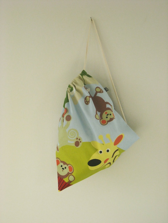 Fargerik, gammeldags gympose sydd i kraftig bomull. Posen har snørelukning med åpning på toppen. Motivet på denne posen er fra jungelen med en zebra, apekatter og andre jungeldyr...