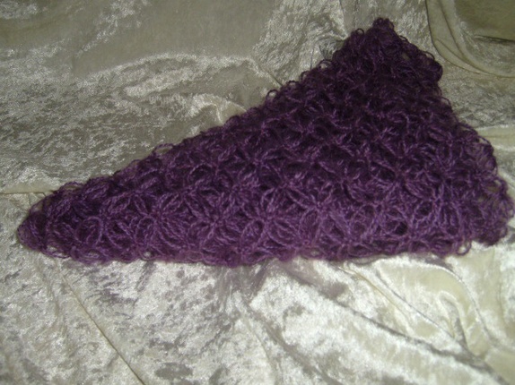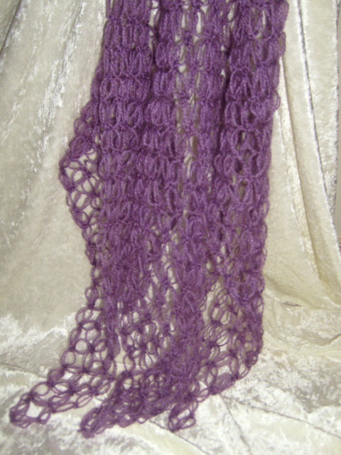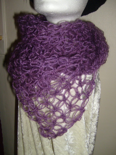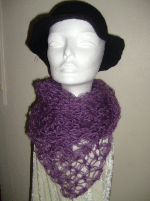 Et herlig og mykt englemaskesjal heklet i mohair i en nydelig lyngfarge .