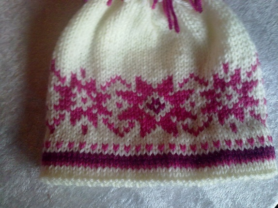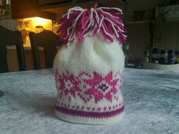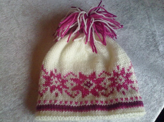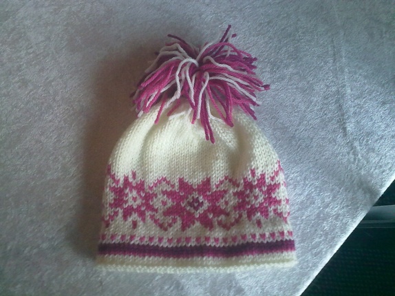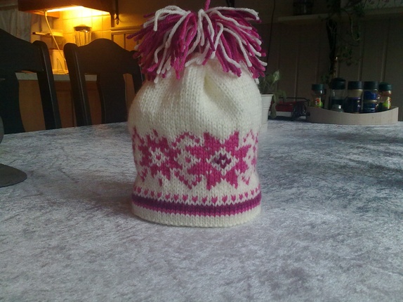 Vm i Oslo 2011 lua, strikket i superwashgarn i fargene offwhite, rosa og lyng rosa.
