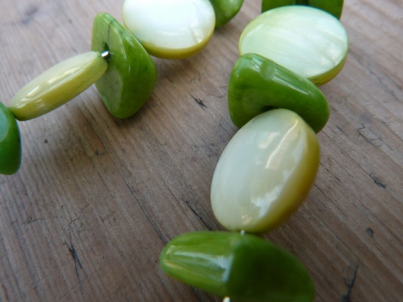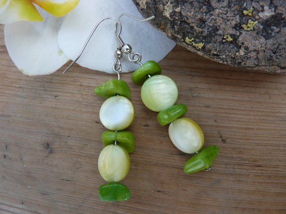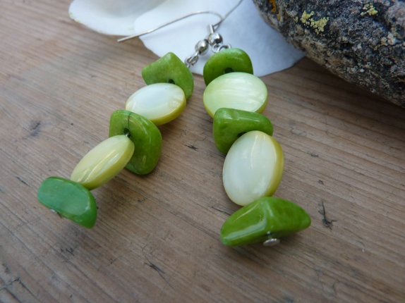 Nette og pene ørepynt som egner seg spesielt til sommeren.Grønne flotte steiner og perlemor med grønn skimmer.Lengde fra ørekrokene og ned er på 4,3 cm Ørekroker av sølvfarget metall.Nikkelfritt.