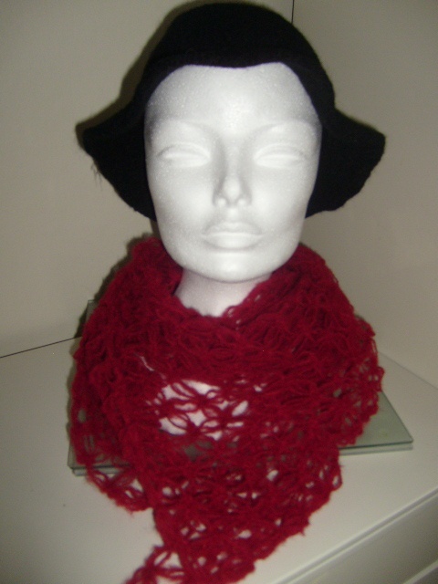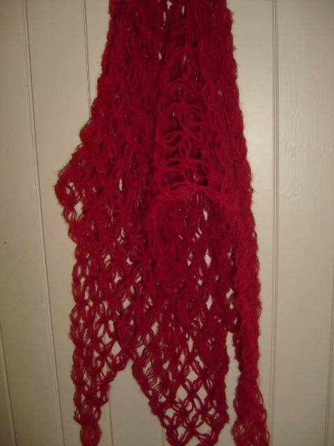 Et herlig og mykt englemaskesjal heklet i eksklusiv dyp rød alpakka.