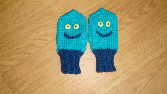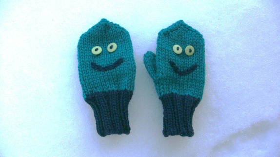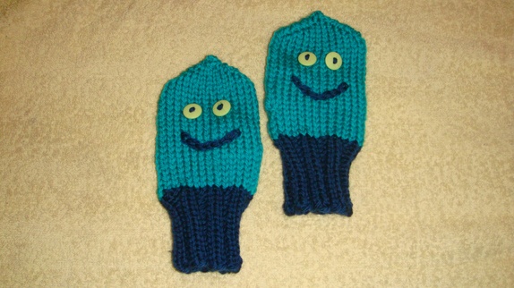Vottene er håndstrikket i Turkis og Marine farget Freestyle 100% ren ny ull.Knappene er lys grønne. Størrelse 2 - 4 år. Vottene kan vaskes på ullprogram 30 grader uten skyllemiddel.