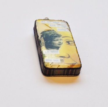 Dette anhenget består av en dominobrikke (2,5 x 5 cm)som er dekorert med forskjellige ting som feks papir utklipp, servietter og bånd for å skape en liten unik og dekorativ collage. Overflaten er beskyttet med dimensional lakk som gir dybde.